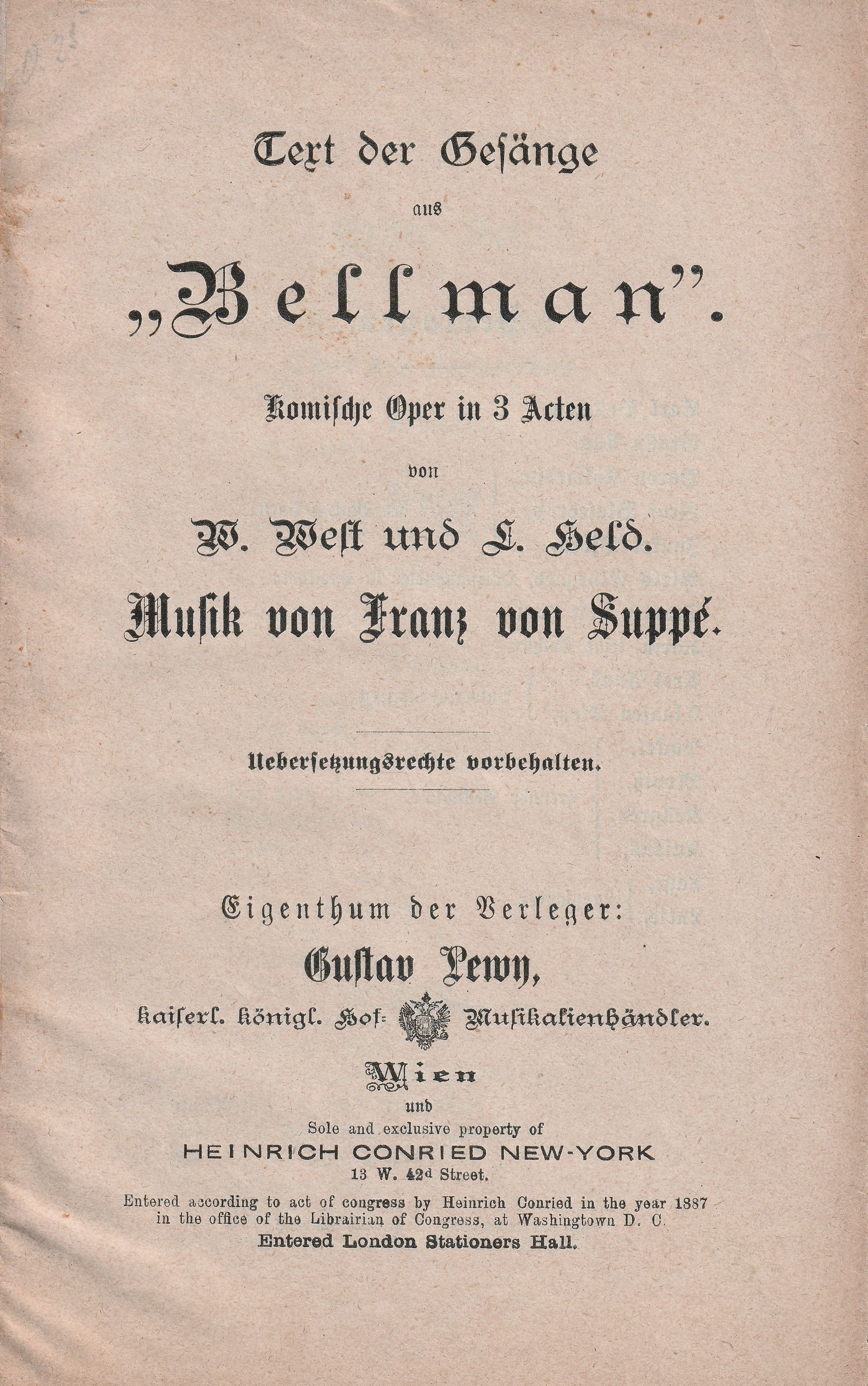 Bellman wurde in Wien nur neunzehn Mal gespielt, aber die Reise endete nicht. Alle Komponisten brauchen einen Verlag. Der absolut mächtigste Musikverleger in Wien im 19. Jahrhundert war Gustav Lewy (der übrigens Gustav Mahlers Impresario war). Gleich darauf gab Lewy mit Suppés Bellman eine Textausgabe heraus, aus der hervorgeht, dass die Exklusivrechte 1887 an Heinrich Conried in New York verkauft worden waren. Der in Österreich geborene Conried war als Schauspieler, Impresario und Theaterdirektor tätig. Zuerst in Österreich und dann in den USA. Er begann seine Karriere als Theaterregisseur an kleineren deutschsprachigen Theatern in New York und beendete seine Karriere als Direktor des Metropolitan Opera House (wo er übrigens eine fruchtbare Zusammenarbeit mit Enrico Caruso begann). Wie auch immer, Suppés Bellman wurde in die USA und dort ins Wallack's Theatre am Broadway in der 13th Street exportiert (das Theater war auch unter den Namen Germain und The Star bekannt). Das deutsche Libretto von Held und West wurde von Chevré Goodwin und William von Sachs für die amerikanische Bühne adaptiert. Die Uraufführung fand am 22. August 1887 statt: