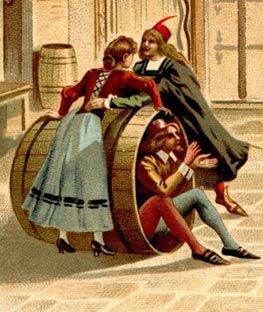 Boccaccio - Der Liebhaber im Fass im Wandel der Zeiten. Bild oben links aus der Produktion des Theaters für Niedersachsen, Hildesheim. Foto: Jochen Quast (www.JochenQuast.de)
