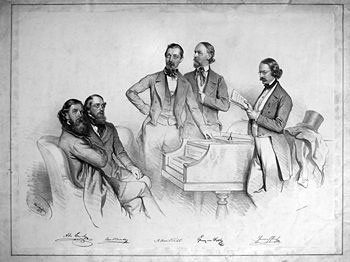Im Kreise von Kollegen (von links: Anton Maria Storch, Carl Binder, Emil Titl, Franz von Suppé, Heinrich Proch). Lithographie von 1852