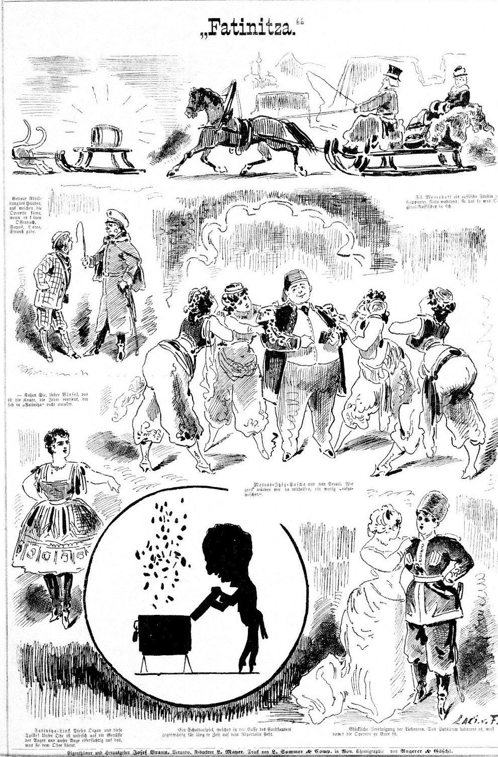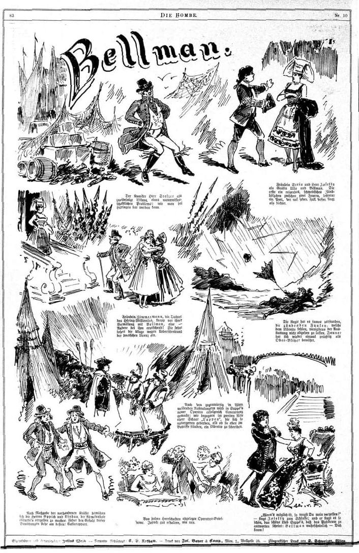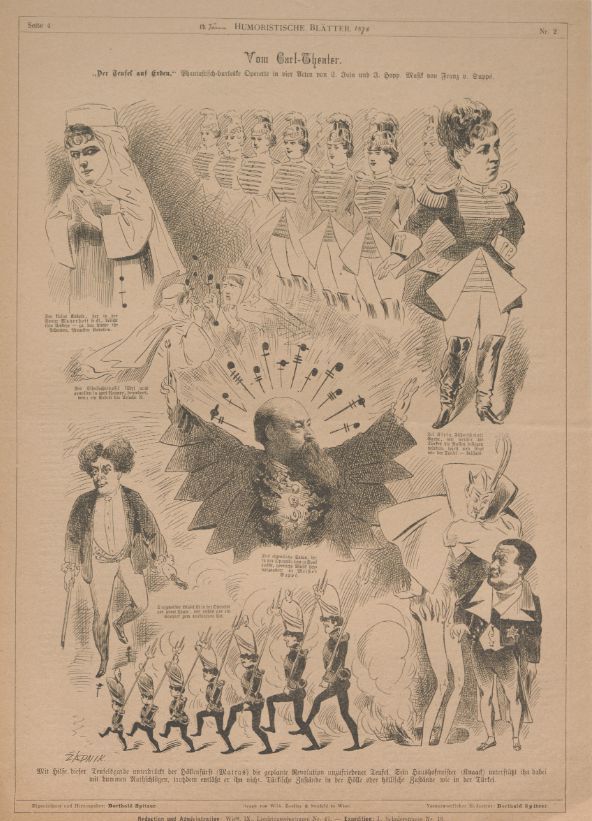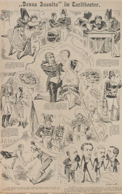 Karrikaturblatt zur Erstproduktion im Cartheater 1876.