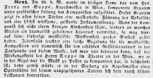 ...Franz von Suppè war ein Meister der Orchestrierung, ein Könner hinsichtlich gut klingender Vokallinien und ein Beherrscher polyphoner Kompositionstechniken: Großartig sind die Chorfugen, wirkungsvoll die Chorblöcke und farbenreich seine melodische Erfindung.