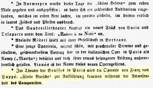 Aus "Blätter für Musik, Theater und Kunst", vom 01.05.1866 unter der Überschrift "Ausländische Bühnen". (Man beachte auch den "Reinfall" der "Schönen Helena" in