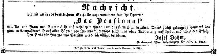 Am 24. November 1860 schlug im Theater an der Wien mit der Aufführung des Einakters Das Pensionat